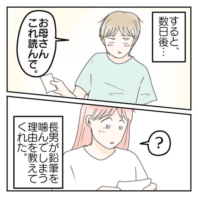 粉々ですね(汗)これは心配になってしまいます。まっちくんが鉛筆を噛んでしまう理由は何だったのでしょうか・・・。