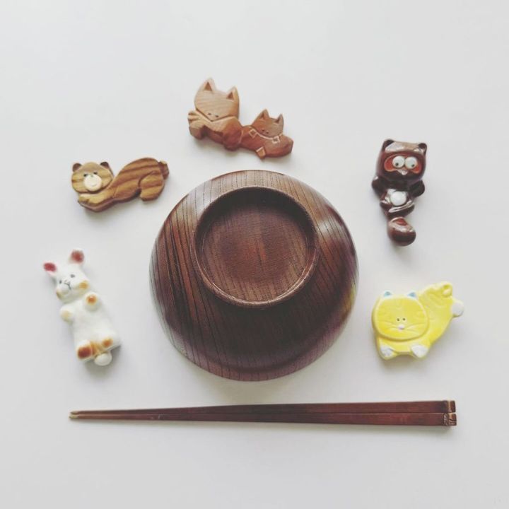 愛用している昭和レトロな箸置き。漆塗りのお椀は、ろくろ舎さんのもの。お箸は市原平兵衞商店さんのものです。