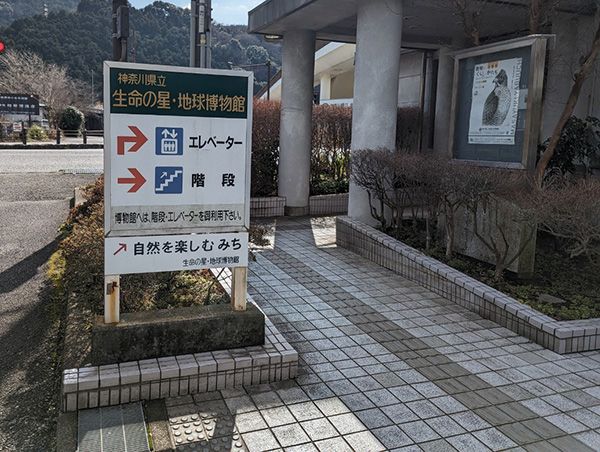生命の星地球博物館は「入生田駅」から徒歩3分。平坦な道が続き、歩道橋を上るのにもエレベーターが使えるのでベビーカーでも安心です。