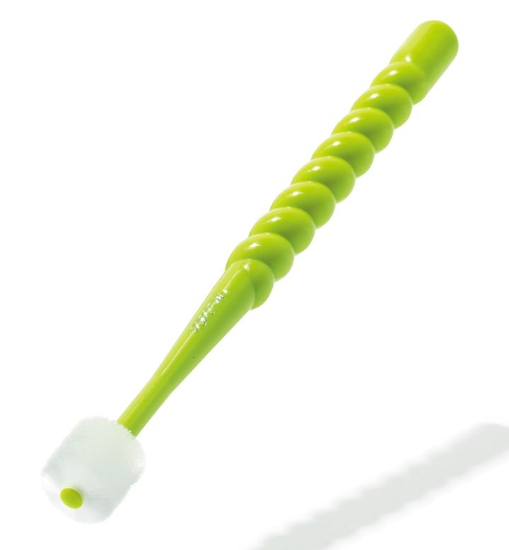 ポイントは、特殊製法で極細毛を高密度&大量に接着した円柱型のヘッド部分。歯磨きで大切なのが、歯と歯茎の境目にある細菌の塊(プラーク)をしっかり取るようブラッシングすること。この歯ブラシを使えば、ブラシのどこを当てても、歯科医が推奨する理想の角度で歯と歯茎の境目に当たり、歯の根元をぐるっと一周、根こそぎ汚れをかき出せます。全ての毛先は丸加工されているので、歯茎に当たっても痛くなく、歯茎や舌のケアもできる優れものです。