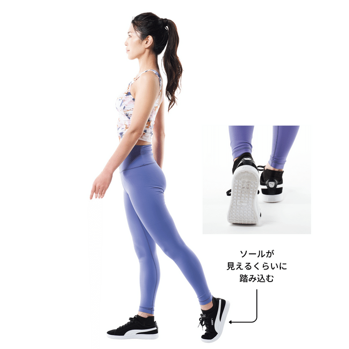 つま先でステップを踏み込む意識が強いと、膝が前に出て、膝を痛める原因に繋がります。