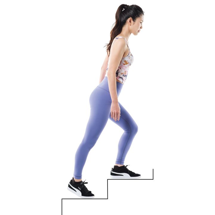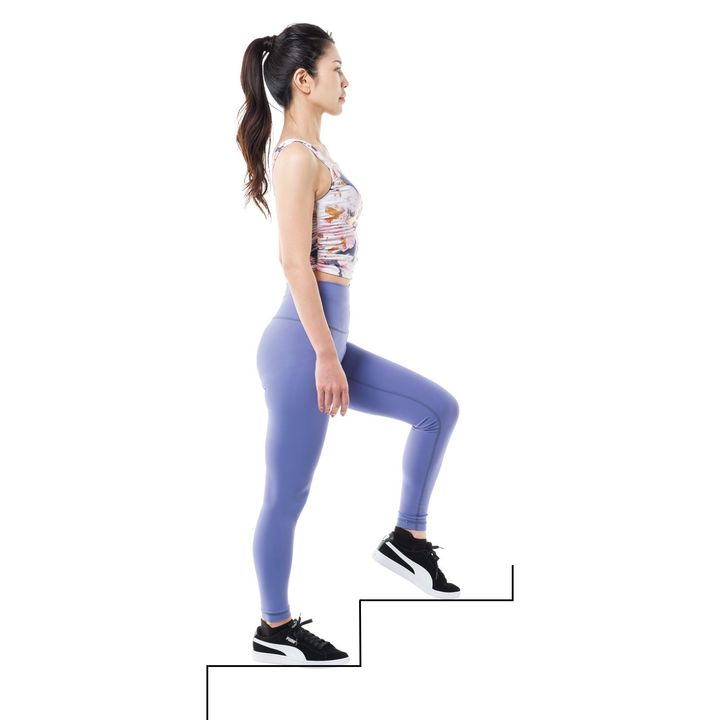階段を上がる動作は腸腰筋を鍛える絶好のシーン。脚で昇ろうとせず、腸腰筋が使えているかを意識して、階段のステップを足裏全体で踏み込む。足腰の筋肉だけで体を上げるのは膝を痛める原因になるから要注意!