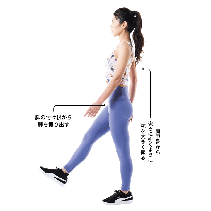 上半身を骨盤の上にのせ、腸腰筋を振り上げるイメージで、膝を伸ばして歩く。前に進もうとせずに、脚を遠くに置きに行くイメージで歩く。