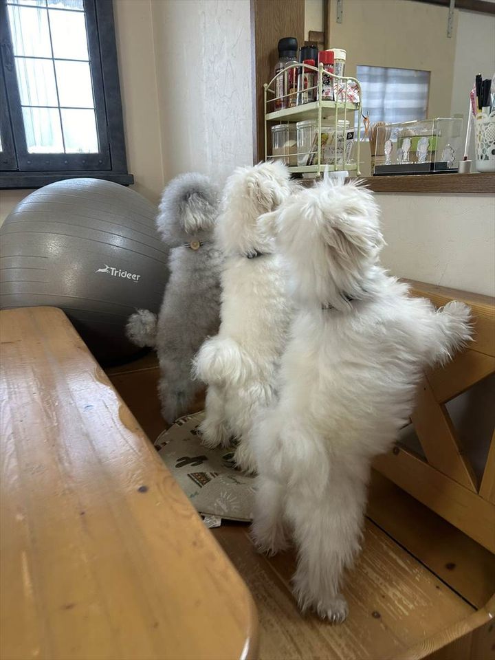 3. キッチンの様子を気にする愛犬たちがかわいすぎる!「どこか絵になる写真」「同じポーズでかわいらしい!」