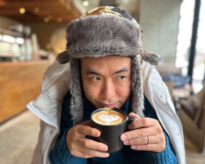 「朝はコーヒーです。それでじっくりゆっくり体を起こす。今朝はカフェラテに。朝起きてから4時間は固形じゃなくてあったか液体で体を目覚めさせてるよ」