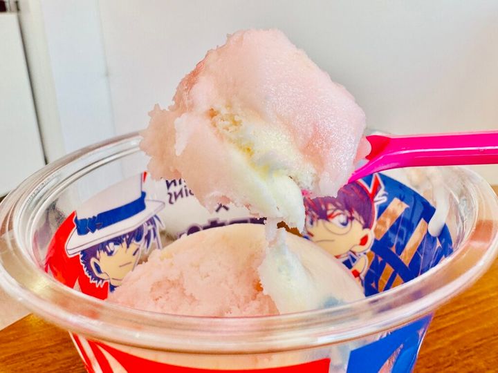 「江戸川コナンのヨーグベリーアイス」と「白桃ブランマンジェ」をミックスして食べるのもおすすめです。フルーティで絶妙なおいしさを、ぜひ試してみてください。