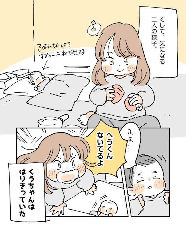 産後二週間半ばで里帰りを切り上げ自宅に戻ったマキノさん。無事に自宅に到着し、寝床の準備に取り掛かるため階段を登ろうとしてハッとします・・・なんと、体力が落ちて階段をスムーズに登れなくなっていたのです。なんとか寝床に辿り着くも、環境が変わったからなのか興奮してテンションが高いくうちゃんはなかなか寝てくれず、へうくんの寝かしつけも難航。不安の残る中、自宅一日目の夜を過ごしたのでした・・・。