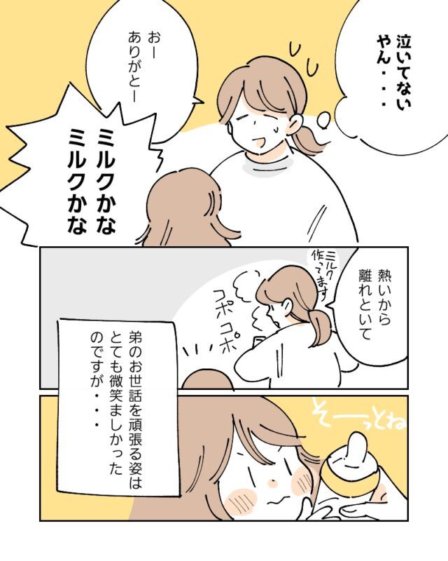 ヒヤヒヤしながらくうちゃんがへうくんにミルクを飲ませる姿を見守るマキノさん。