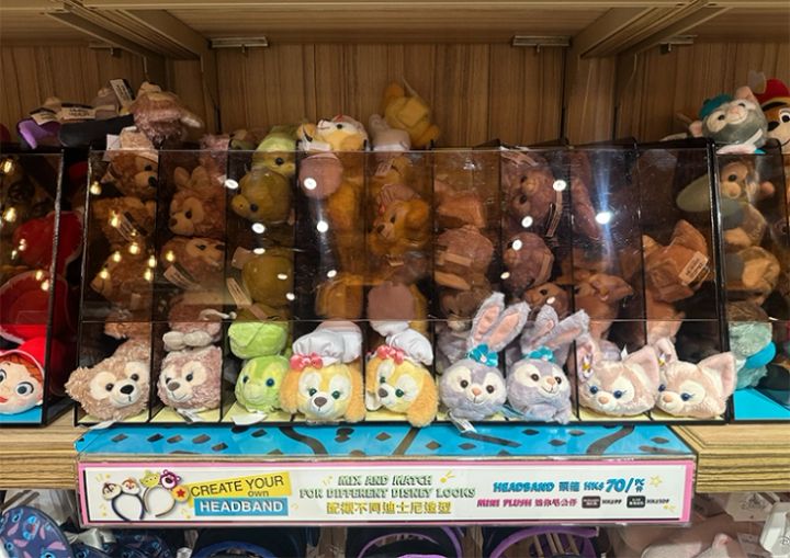 香港ディズニーランド・リゾート限定のカスタムカチューシャが大人気。自分の好きなキャラクターのマスコットを選んでベースとなるカチューシャ(HK$70)につければ、自分だけのオリジナルカチューシャが作れます!マスコットはひとつHK $109。