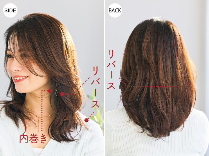 ①リバース巻きと内巻きでつくるルーズなスタイル