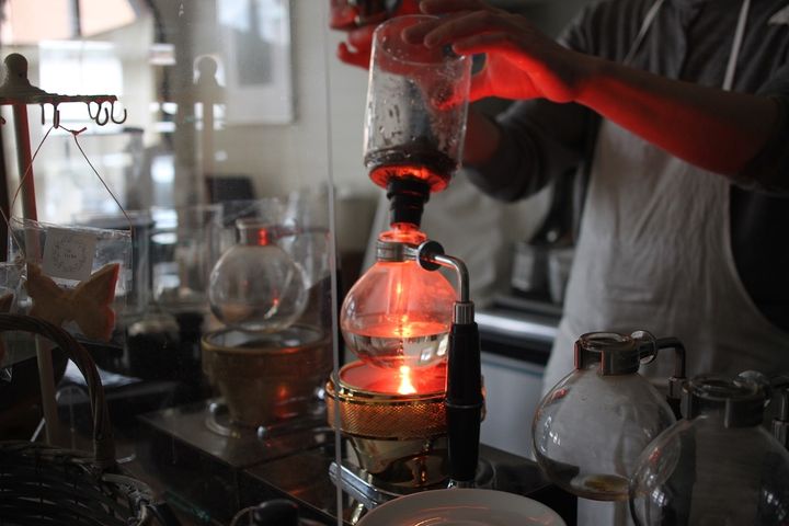 香り高いコーヒーはサイフォンを使って入れています。熱源であるビームヒーターの赤い光がフラスコを照らす様子は、まるで魔法や理科実験のようでワクワク!店内に漂うコーヒーの香りにも癒やされます。