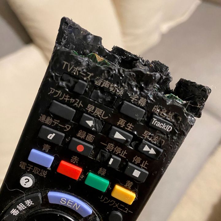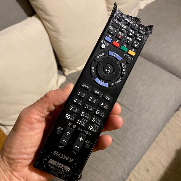 こんにちは、ハルくんです。先日、ほぼフルに入っていたボックスティッシュをひと箱やっつけた僕ですが、今回はさらにものすごいのでご披露いたします。事件があったのは数日に渡ってかーちゃんの仕事が忙しかった日の夜。「ハルくん遅くなってごめんね〜」って帰宅したかーちゃんが、絶句。こんな状態になったテレビのリモコンですが、音量調節もチャンネル変更もできて、SONYってすごいよね。でもON/OFFスイッチは完全に消滅しており「どーやってテレビ消すの〜」と半泣きのかーちゃんでした。ビデオのリモコンで消していたけどね。