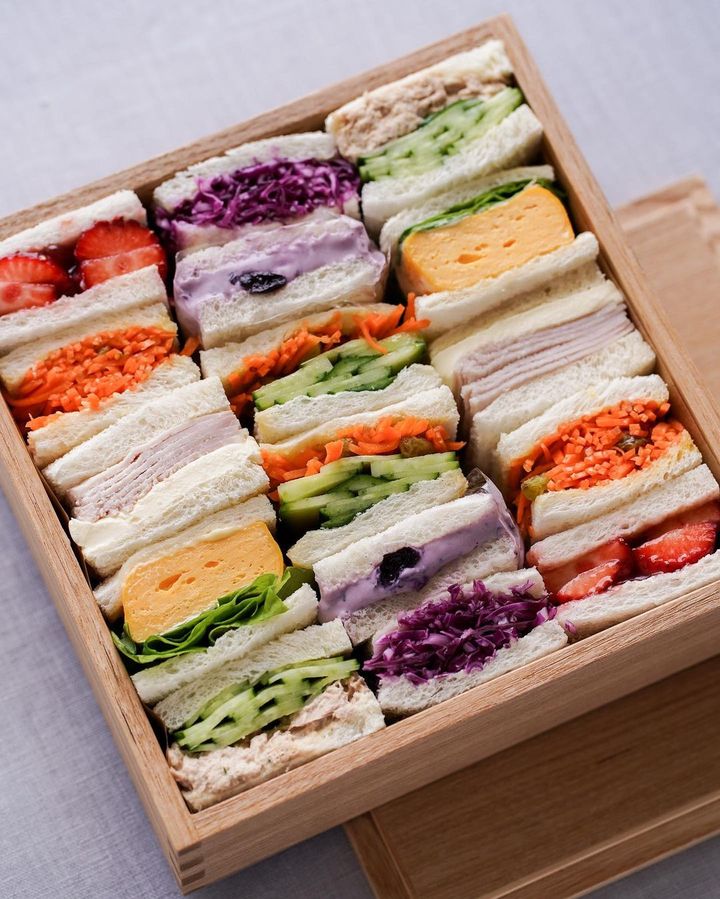 おかずを用意するのが大変なときは、具を挟むだけで作れるサンドイッチもおすすめ。こんなおしゃれな「レインボーサンドイッチ重」なら、周りから歓声があがること間違いなしです!