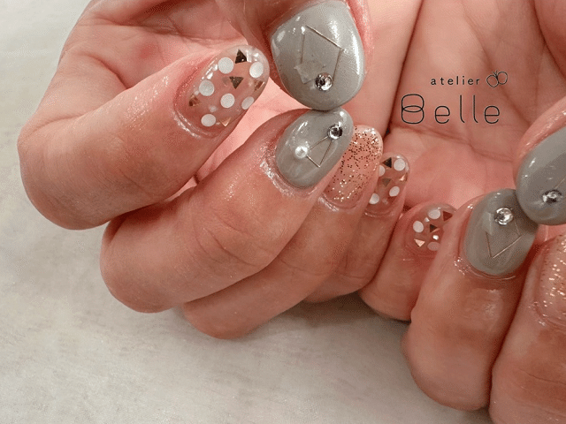 3. 【おすすめキラキラネイル!】落ち着いたグレーに映えるゴールドパーツで上品な華やかさを演出してみませんか?