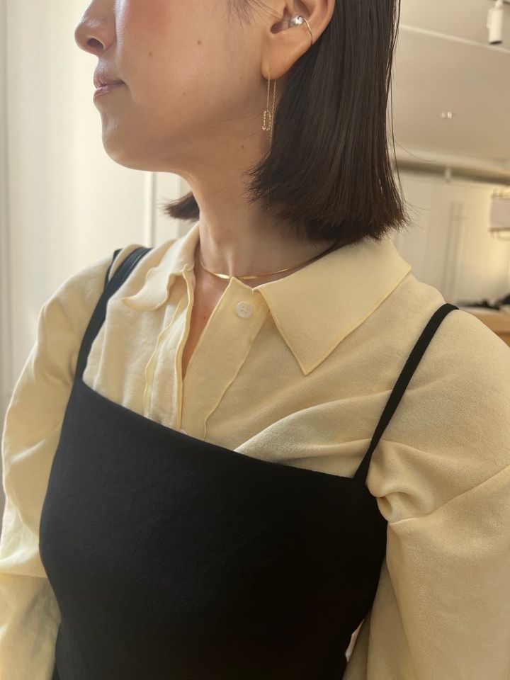 「イエローのシャツに合わせて、ジュエリーは全てゴールドで統一。スタイリングがシンプルなのでイヤカフと揺れるピアスをアクセントにしました」シャツ¥22,000、キャミソール¥19,800(共にベッド&ブレックファスト/Greed International Tokyo Store)