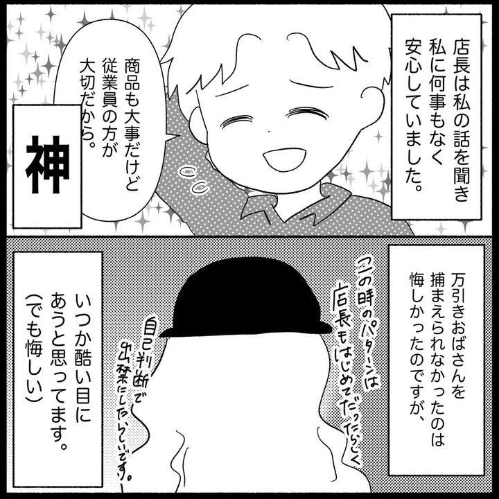 万引きを目撃したことはありますか?この物語は、著者・たに(@tanidesu__)さん自身の体験談。たにさんはアパレルの販売員をしていた頃に万引き犯と対峙したことがありました。お客さんから万引き犯の目撃情報を聞き、勇気を出して声を掛けたたにさん。いよいよ万引き犯と対峙します。『万引きおばさんをつかまえろ!』8話をご覧ください。