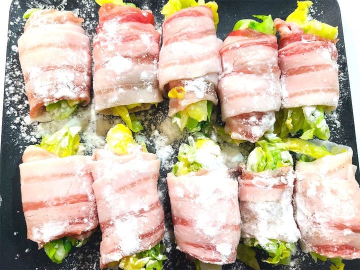 5.巻き終わったら、さらに上から片栗粉をまぶします。タレが絡みやすくなりますよ♪