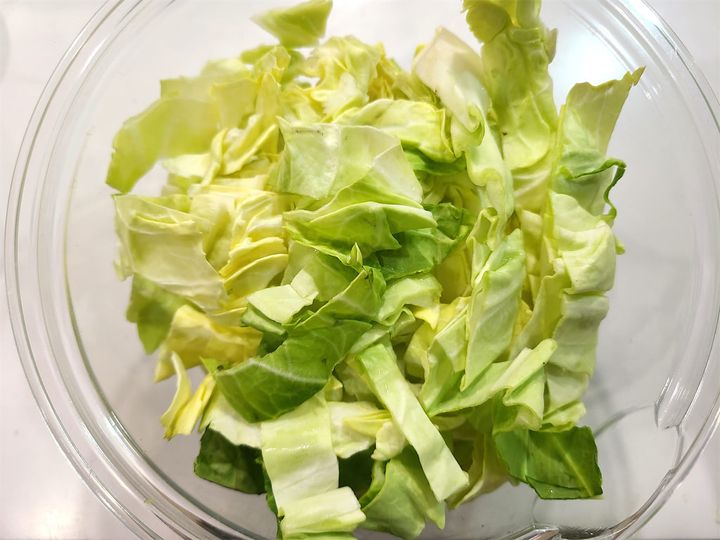 1.キャベツの芯を落とし、少し太めの千切りにします。だいたい5mm幅くらいで、繊維を断ち切るように切りましょう。切ったキャベツを洗い、水を切ったら耐熱ボウルに入れ、ふんわりラップをかけて600Wの電子レンジで3分加熱します。