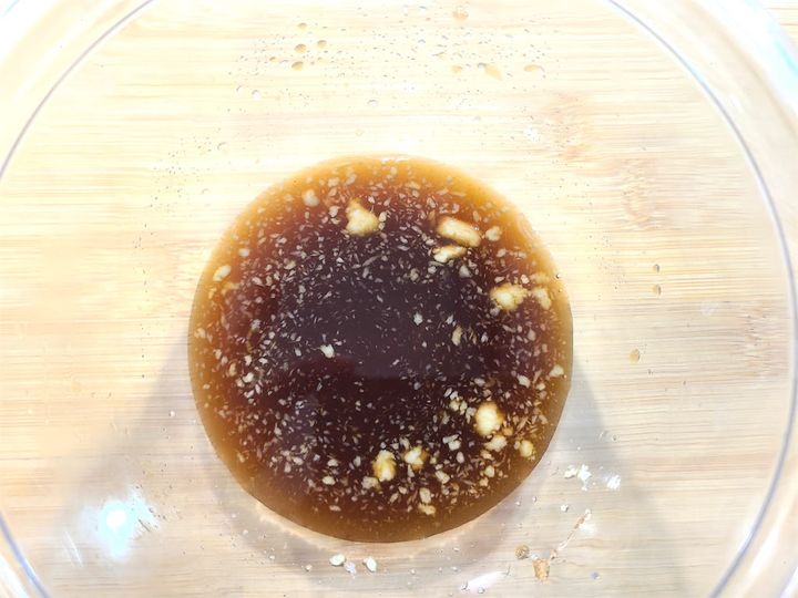 2.キッチンペーパーなどでキャベツの水気を取り、少し広げて粗熱をとります。冷ましている間にタレを作っておきます。しょうゆ、酒、みりん、砂糖、おろししょうが、おろしにんにくをよく混ぜ合わせます。酸味が飛び過ぎないように、酢はここではまだ入れません。