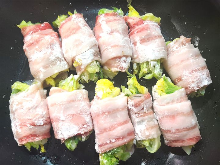 6.フライパンに薄く油を引き中火にかけ、フライパンが温まったら肉の巻き終わりを下にして並べます。並べ終わったらフタをして、弱火で3分ほど蒸し焼きにします。