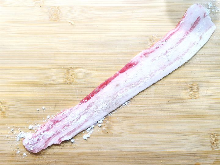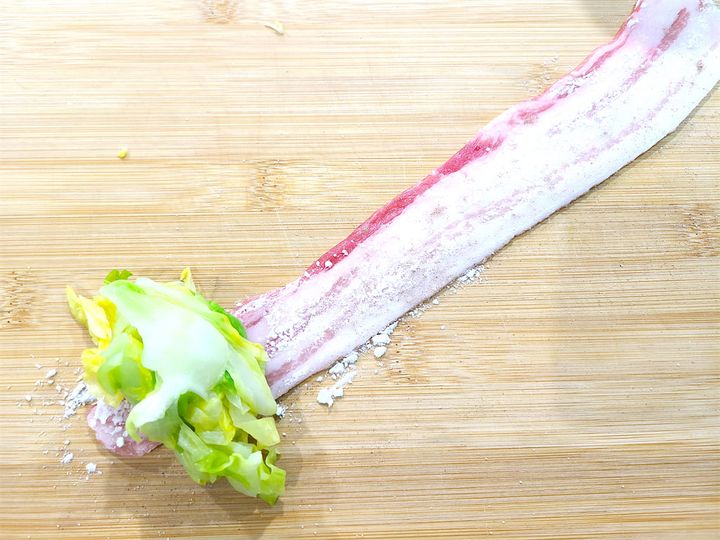 3.肉を広げて軽く塩、こしょうし、片栗粉をまぶします。片栗粉をまぶすことで、お肉とキャベツがしっかりと密着してくれるそうですよ!