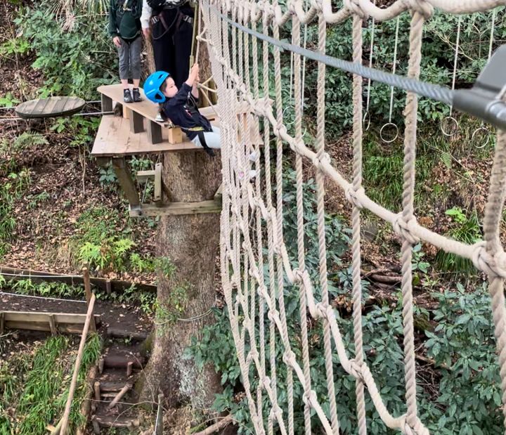 1番やりたかったアクティビティ、クスノキの上に作られた、地上9m全長84.7mのアスレチック『樹上の空中散歩』。5歳以上、身長108cm以上、体重130kg以下の方が対象です。5歳、109cmの娘が挑戦しました。