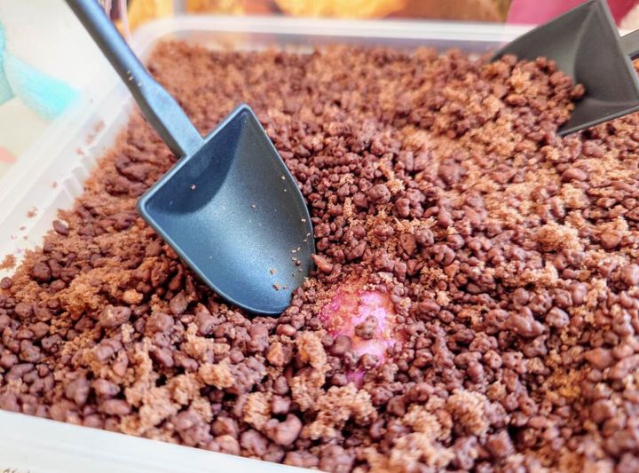 パッケージを開けたら、一面が畑! と思いきや、細かく砕いたチョコレートのスポンジケーキとクランチチョコレートを混ぜたチョコレート菓子を土のように敷き詰めています! 芸が細かい!