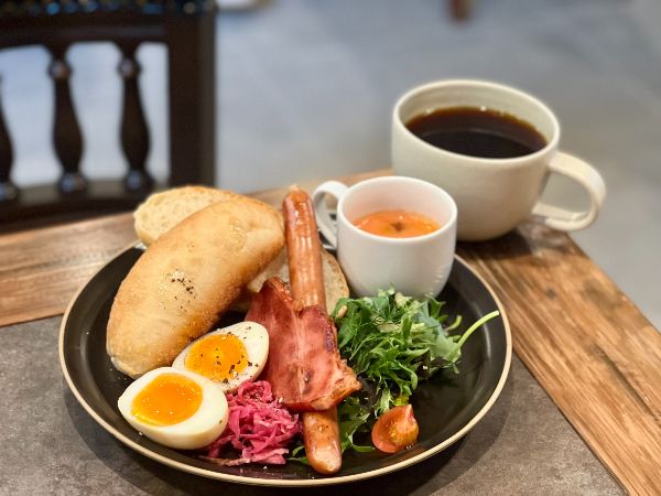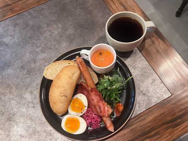 朝からパワーチャージできる盛りだくさんの贅沢プレートです。お店で焼き上げたパンはオリーブオイルのフルーティーな香りが漂ってぼーっとしていた頭を覚醒させてくれます。サラダにはオリジナルドレッシングがかかっていて野菜もさらにおいしい。分厚いベーコンの香ばしい香り、長いウインナーがジューシーでうま味がしっかり。半熟卵は絶妙の半熟加減でぱらりとかかった胡椒がアクセント。この日はトマトのスープがついていて濃厚で、トマトや玉ねぎなどの甘味が前面に出ていて体がきれいになったような感覚になります。