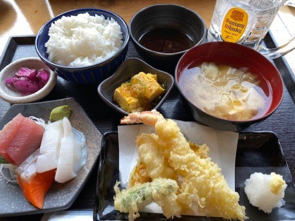 コスパよしとのこと。えびす御膳(825円)に。セルフ天丼と海鮮丼で楽しみ、大根、キャベツ、かぼちゃに豆腐が入ったお味噌汁もおかわり!小鉢の卵焼きもGood♪