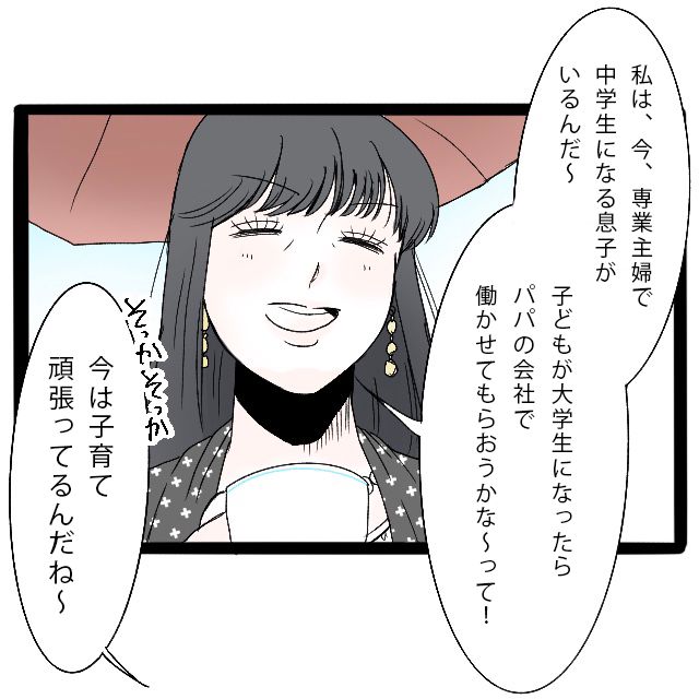 「私は今、専業主婦で中学生になる息子がいるんだ~子どもが大学生になったらパパの会社で働かせてもらおうかな~って!」