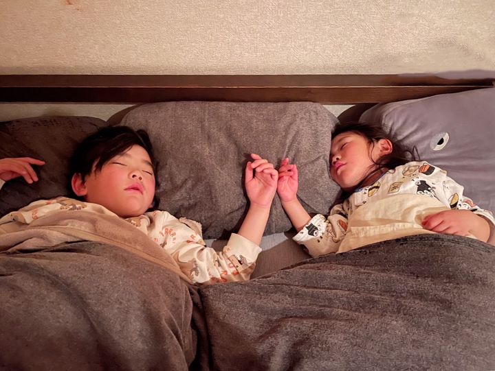 眠いふりして抱っこされた子供たち、腕の中でニヤニヤしているらしい。