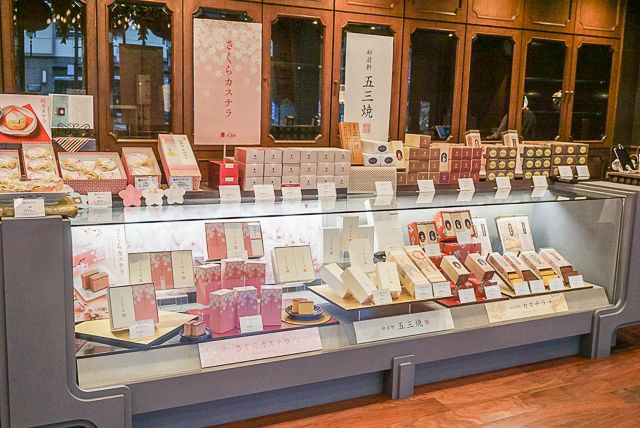 店内のショーケースには、定番から季節限定まで豊富な商品がずらっと並んでいます。筆者が訪れた時期は「さくらカステラ」が限定で販売されていました。