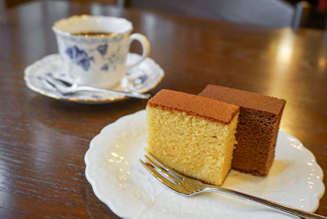 1階の店舗に並んでいた松翁軒の看板商品「カステラ」と「チョコラーテ」。喫茶では、これらを一切れずつ味わえる「松翁軒カステラセット(850円)」をいただくことにしました。江戸時代から続く伝統の味を、一度は食べてみなくては。2種類の主力商品を食べ比べできるおすすめのメニューです。