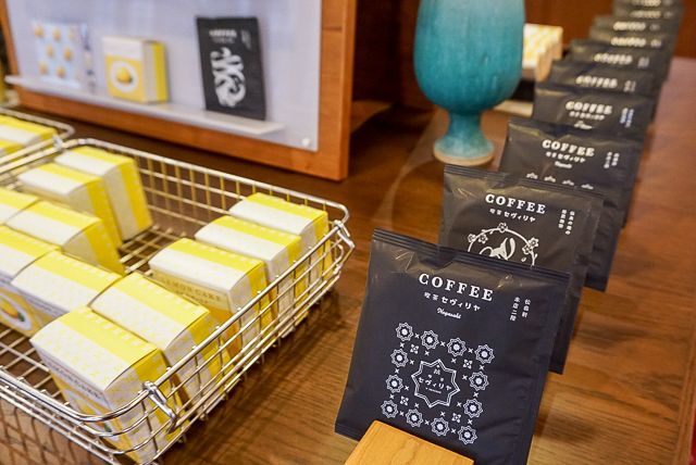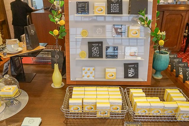 喫茶店の中央に設けられたお土産コーナーのチェックもお忘れなく。店舗限定商品をゲットできる貴重なスポットです。
