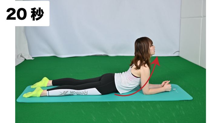 前腕を付けた状態でうつ伏せになり、おなかの前の部分を20秒かけてストレッチ。普段なかなか伸ばす動作をできない前部分を伸ばすことで呼吸がしやすくなり、刺激が入ることで痩せやすくなります。