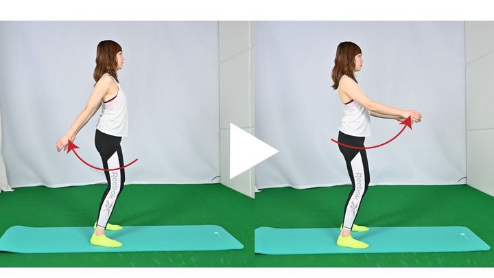 脚を肩幅に開いて立ち、息を吸っておなかを1センチ引っ込めます。膝を少し緩めた状態で両腕を前後に揺らし、肩回りをストレッチ。この時、頭の重みで前傾し、猫背になりがちなので、体の横に鏡を置くなどしてなるべく正しい姿勢を保って。