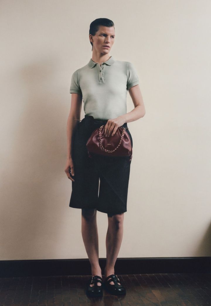 「フラメンコ」シリーズの特徴である、コイル状の結び目を引いてバッグを閉じたときに“フラメンコダンサーのスカート”のような形状となるディテールを再解釈しつつ、2枚の滑らかなレザーの断面を見せないように組み合わせることで、持ったときにからだにとけ込むようにフィットする官能的なシルエットを実現。