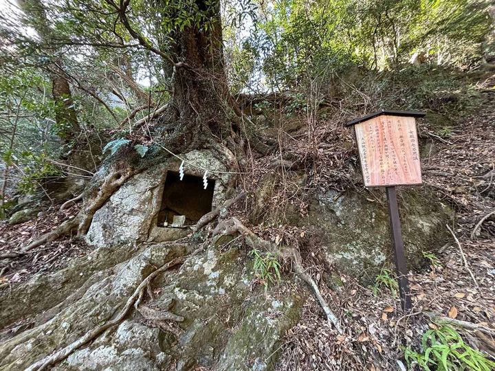 七不思議の中で最も興味深かったのは、大山寺を発ってすぐにある潮音洞(ちょうおんどう)だった。紙垂の下げられた岩盤の穴から潮騒の音が聞こえるのである。もちろん超自然的な怪異ではなく、科学的な自然現象だろう。木々や近くの水流の音が四角形の穴の中でうまいこと反響すると海みたいに聞こえるんだなぁ、とついつい乾いた考察をしてしまったが、しかし怪異でも自然現象でも不思議は不思議なのだ。