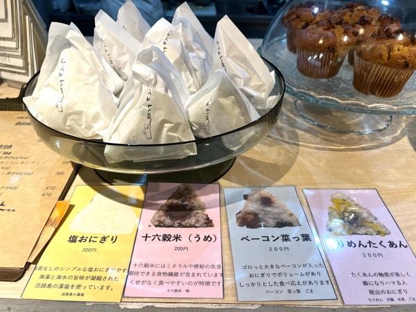 おにぎり2個セット680円 みんみんは、十六穀米入りの鮭と鯖生姜のおにぎりを選びました。鯖生姜は鯖と生姜の甘塩っぱさとキュウリのぱりぱり食感がおもしろい組み合わせです。十六穀米と鮭はテッパンのおいしさです。その他にはベーコン菜っ葉、塩おにぎり、キンパ、ちりめんたくあん、十六穀米(梅)、枝豆塩昆布、とろろ昆布、ツナマヨ青のり、鶏そぼろ、五目いなりなどもあります。 おにぎりの海苔は「すまうら水産」の須磨海苔を使用しているこだわりぶりです。