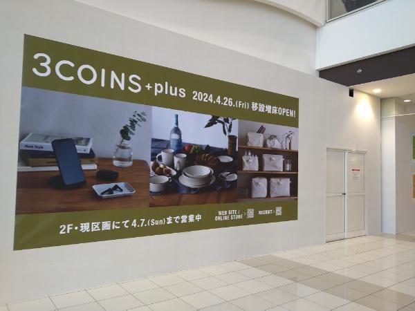 また、2階にあった雑貨屋さんの「3COINS」が1階に移転、「3COINS+plus(スリーコインズプラス)」になってオープンします。