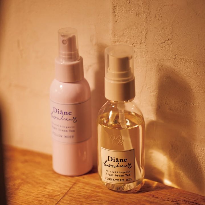 左から:ダイアン ボヌール ナイトドリームティーの香り おやすみピローミスト 95mL ¥1,540、ダイアン ボヌール ナイトドリームティーの香り シグネチャーオイル 90mL ¥2,189(共にダイアン ボヌール/ネイチャーラボお客様窓口)