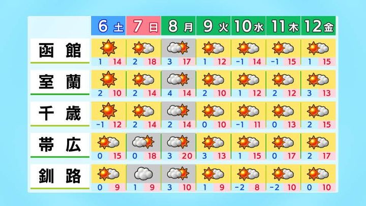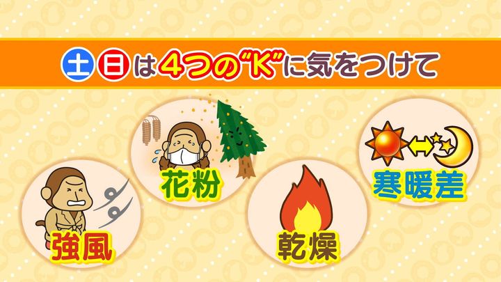 7日(日)も広く晴れて、さらに気温が上がります。最高気温は広く15度前後で、札幌は17度、北見では19度まで上がるでしょう。土日は行楽日和になりますが、春の4K「乾燥」「強風」「気温差」「花粉」に気を付けて下さい。