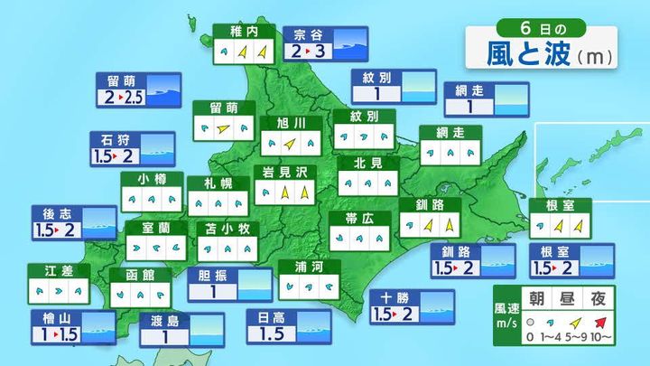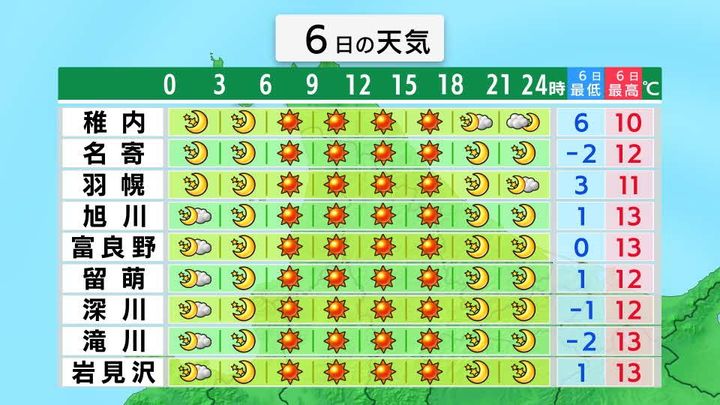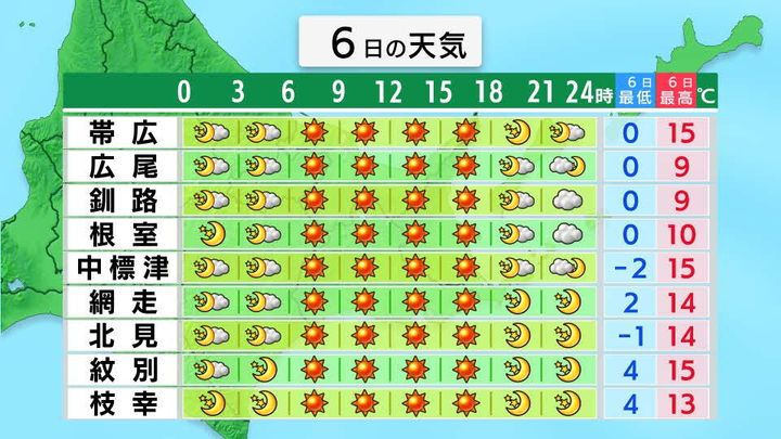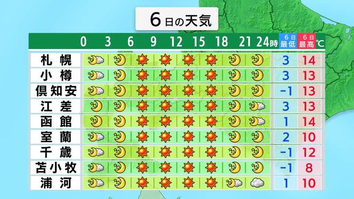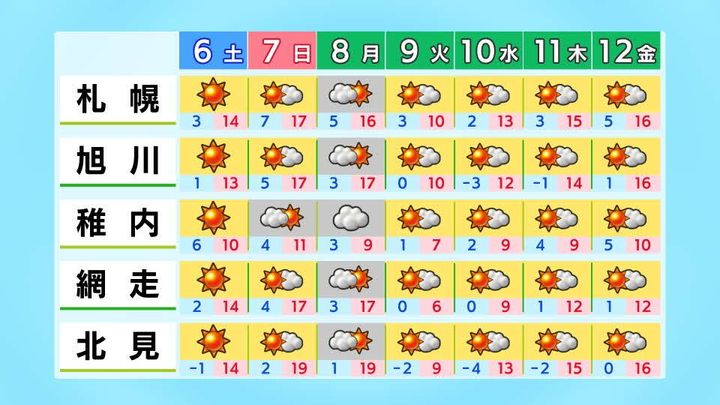 日中の最高気温は、太平洋側の海岸部や稚内で10度前後の他は、13度くらいまで上がります。札幌14度、帯広と紋別の15度は、今年一番の暖かさになるでしょう。山では、なだれにも注意が必要です。また朝晩と日中の気温差が大きくなるため、服装選びに気をつけて下さい。