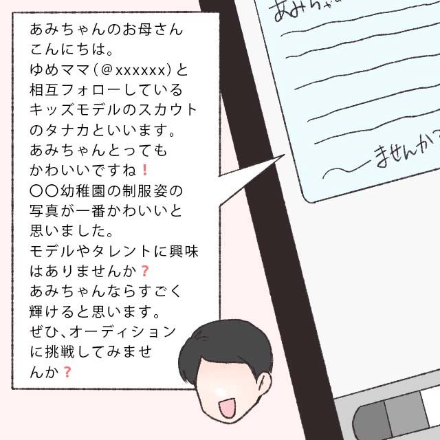 「あみちゃんママこんにちは!」とキッズモデルのスカウトのメッセージでした。