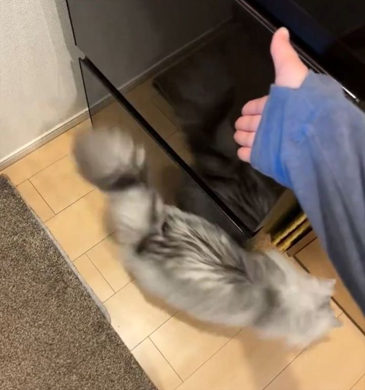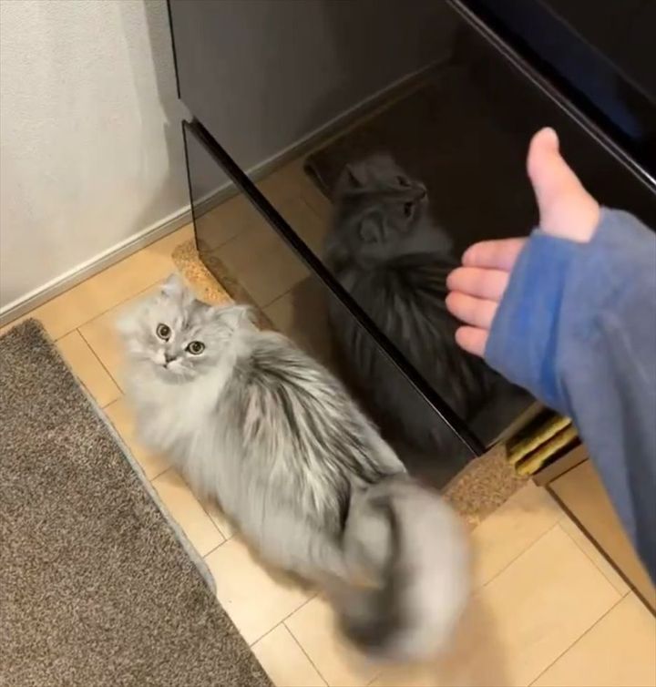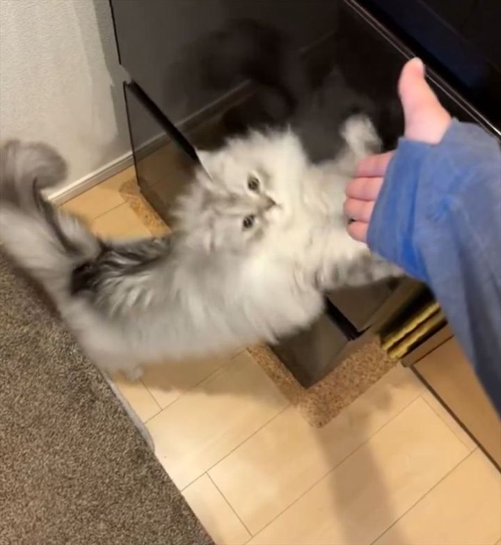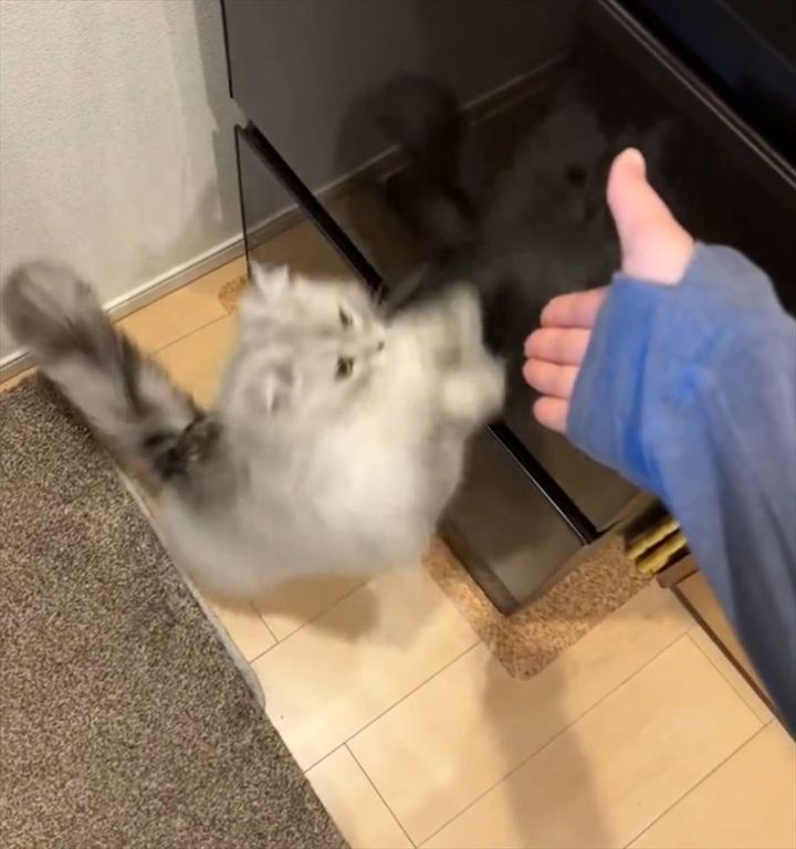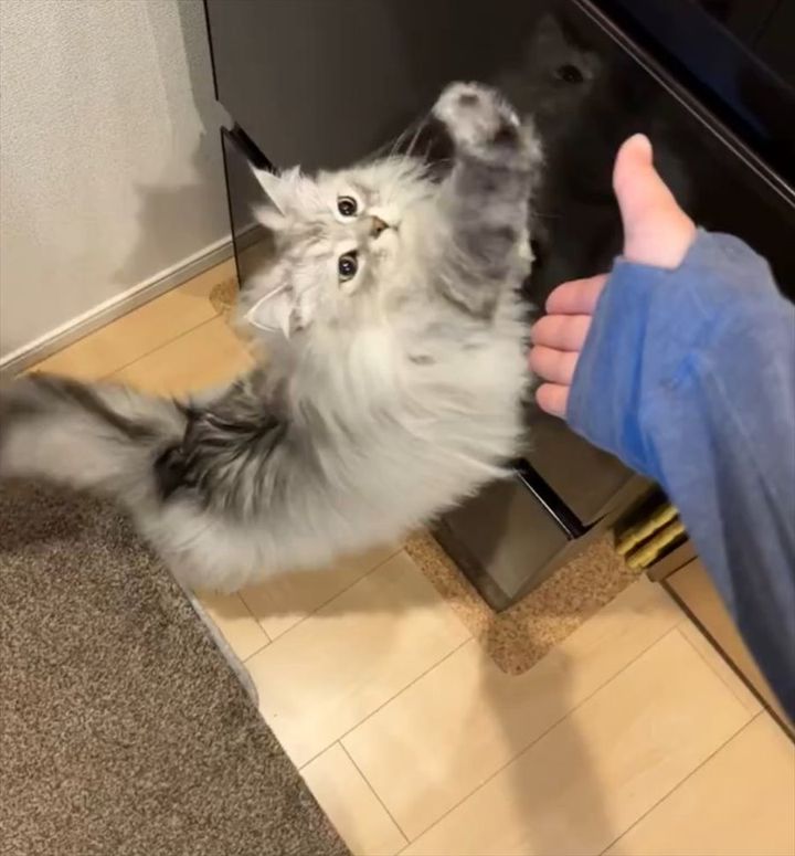 飼い主さんの手にタッチしようとしたサイベリアン。 残念ながら失敗してしまうその姿が話題となっています。