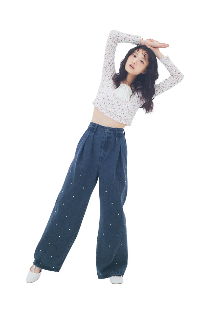 柄×ビジューの華やかさで究極自分ウケルックの完成!乙女チックな小花柄にきらめくビジューでとことんビジュ映え♡ ワイドパンツとクロップド丈できゃしゃ見え狙いも◎。