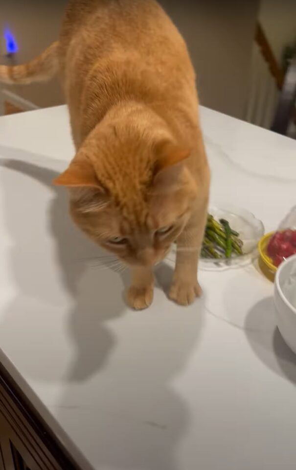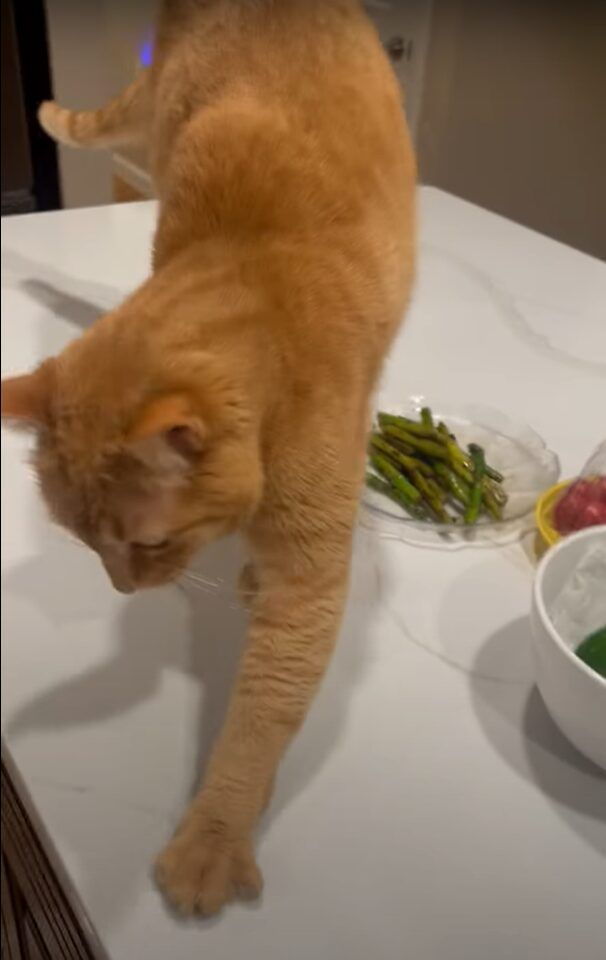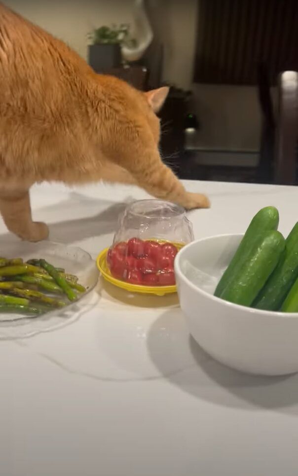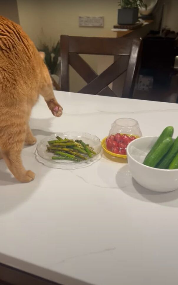 この行動を、飼い主さんはお皿に盛られたアスパラガスに土をかけようとしていると説明されています。 たしかに、この猫の動きはアスパラガスを中心にしていますね! においが気になったのでしょうか?