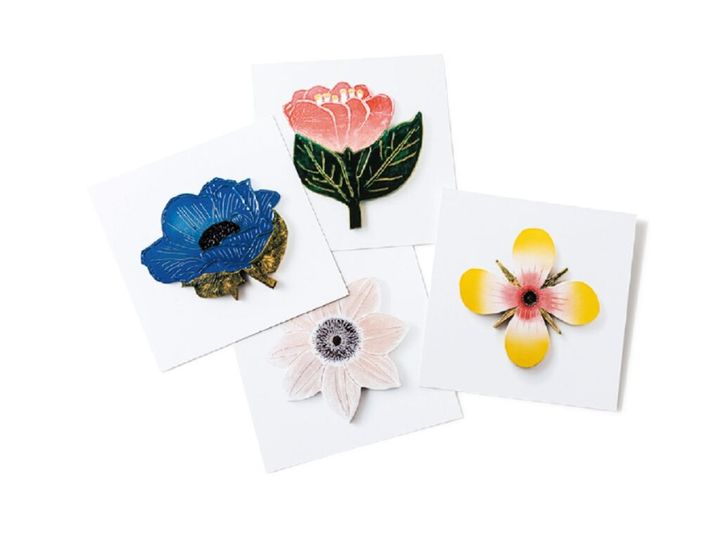 『マリメッコ』のデザイナーとして活躍した石本藤雄さんによるレリーフ作品を、高精度な印刷技術によりプリント。実物の色や質感が浮かび上がってくるようなカードは、飾りたくなる美しさ。各¥250(ムスタキビ TEL:089・993・7497)