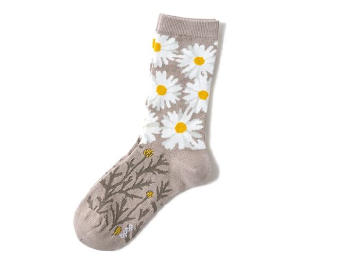 日本とフィンランドでテキスタイルを学んだ氷室友里さんによるデザイン。足部分は茎と葉、足首部分はマーガレットの花。見える部分によって印象が変わるのが面白い。ソックス¥2,200(ユリ・ヒムロ/bpbp )