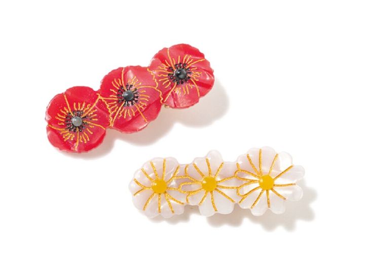 フランス人デザイナーが手がける、アクセサリーブランドのヘアクリップ。ヴィンテージ感のあるセルロース製で色合いが美しく、大人な装いにもマッチ。ポピー、デイジー 各¥1,210(クク シュゼット/モットハウス・トーキョー TEL:03・6325・2593)